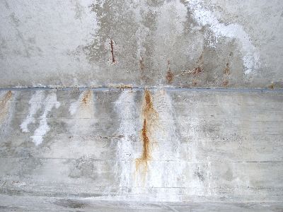 Betonschäden mit Korrosionserscheinung infolge Durch- feuchtungen, Rissbildungen, Ausblühungen, undichte Fugen an einer Parkdeckuntersicht mit Unterzug. Erst nach einer sorgfältigen Bestandsaufnahme (Dokumentation) kann ein Instandsetzungskonzept mit Kostenschätzung erarbeitet werden.